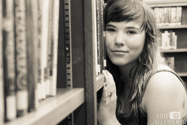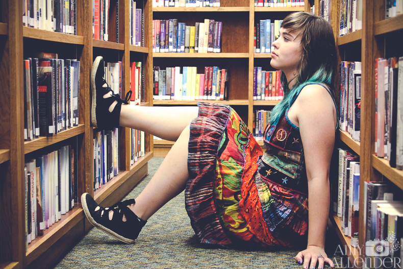 I was so excited about her bookworm tendencies that I took things a step further by getting the okay to shoot a few inside Minot’s public library. I wasn’t sure if she would think this was a good idea or totally lame. Lucky for me, Allene was up for trying anything my crazy mind could come up with. And I’m so very pleased with the result. {Also, isn’t that dress amazing?!}