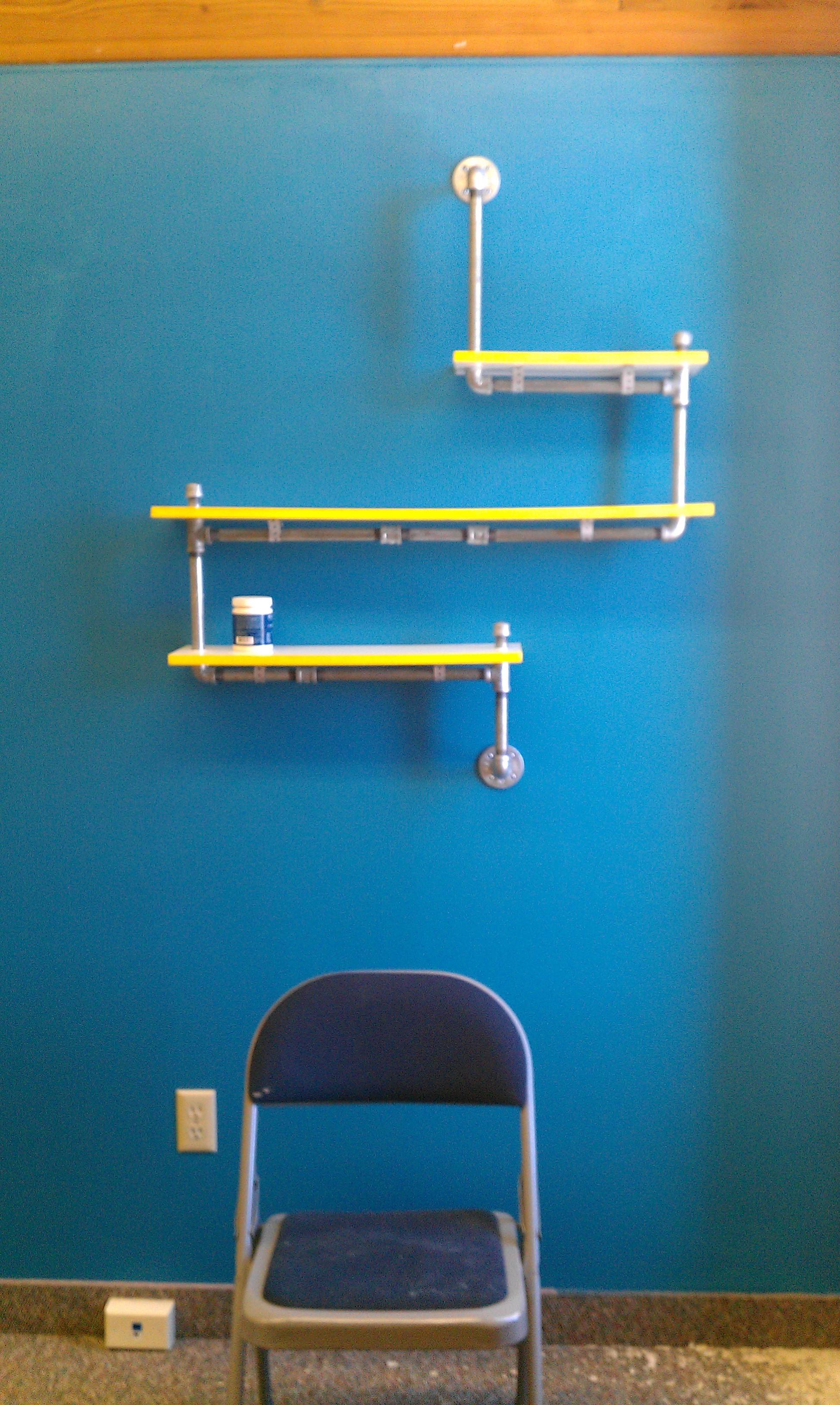 I wish I’d taken better before photos. But I really dropped the ball. Originally there were huge, dated cabinets {upper and lower} and a counter along the side wall. Those were removed because the storage just wasn’t necessary. We painted with poppy colors and I {with the help of some handy teen girls} built a new shelving unit from galvanized pipes.