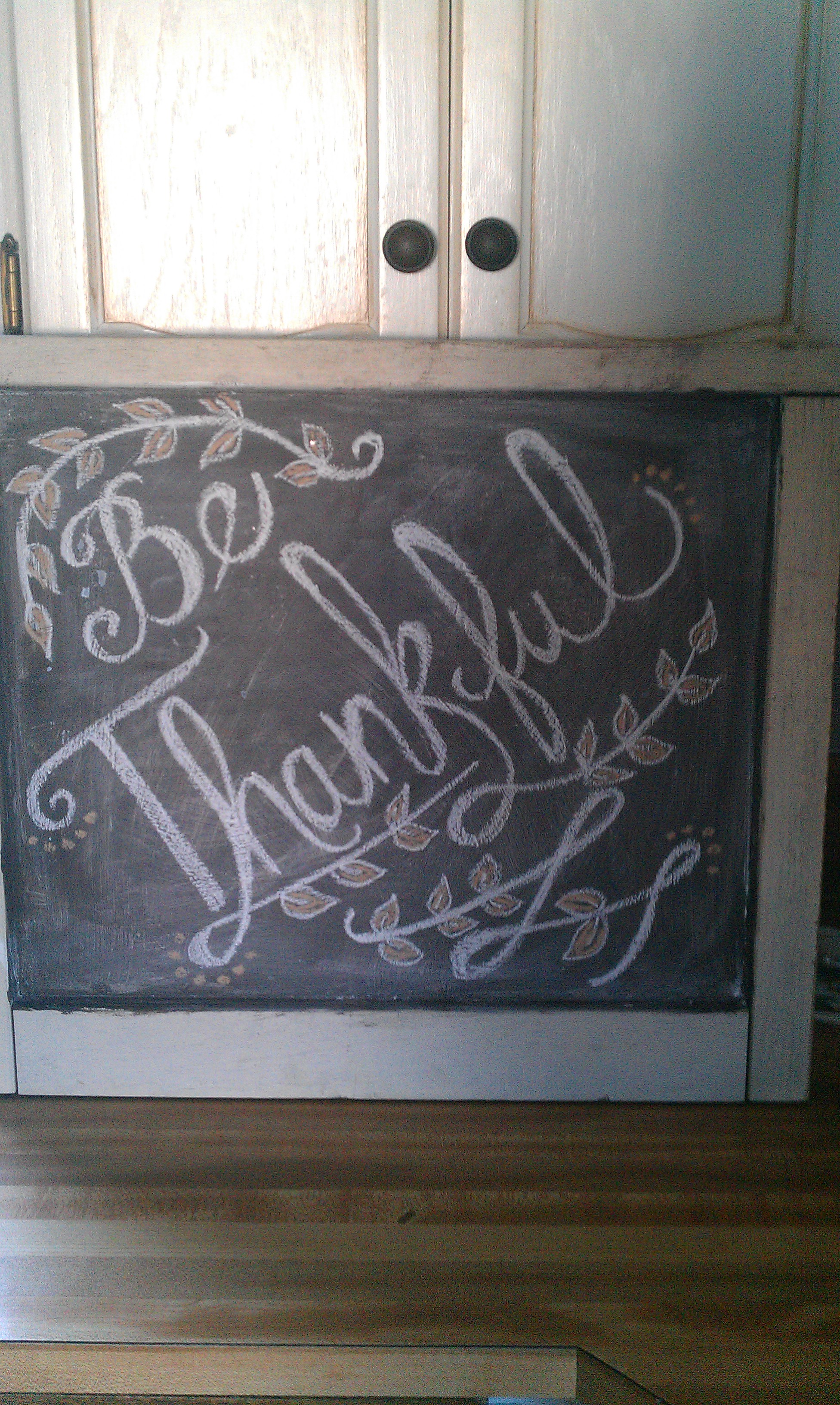 I drew this Thanksgiving chalk board. {Instructions for your own chalkboard here.}