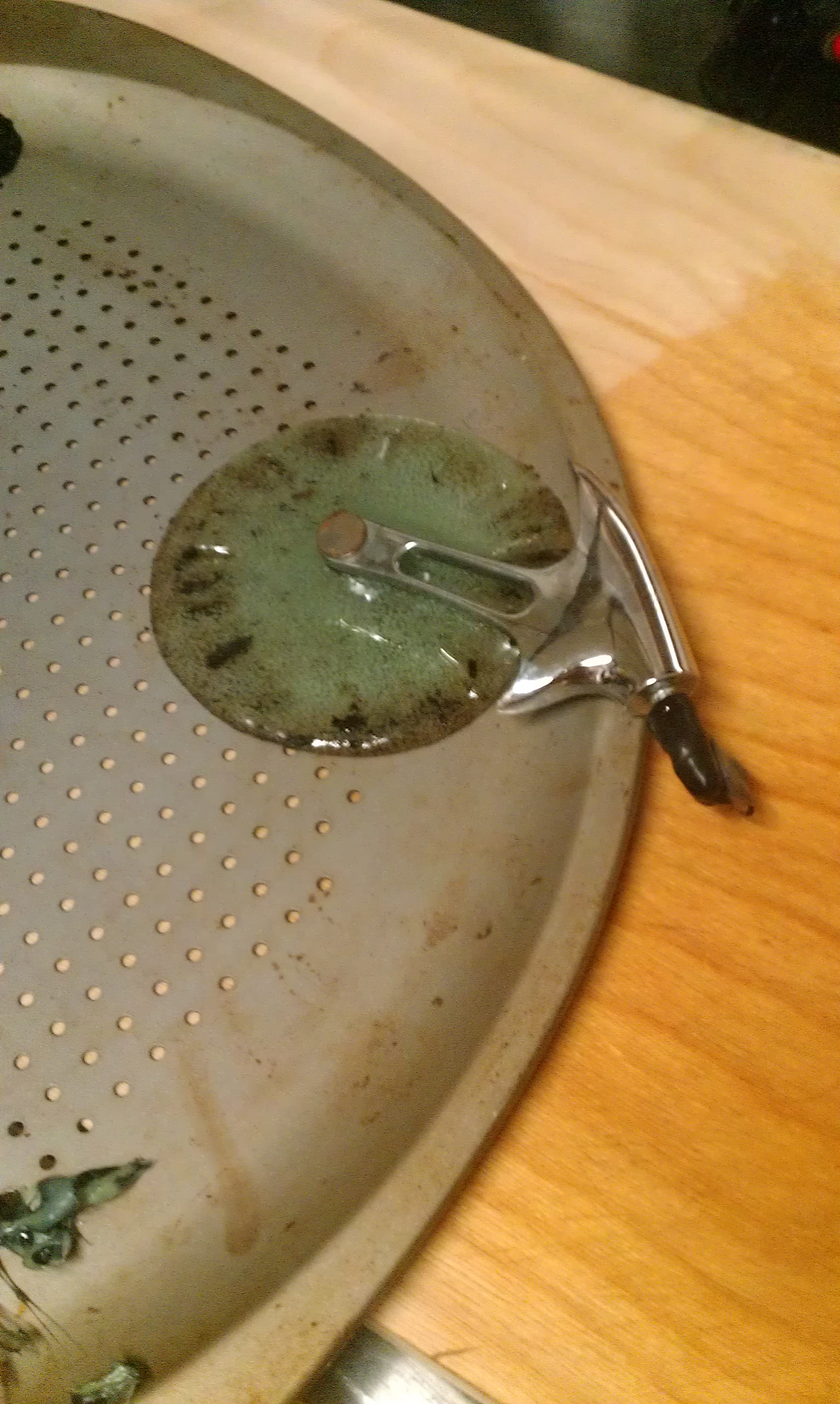 Derek and I are taking a stint of dance classes. Fun, I know. We had some friends over for dinner before we all went dancing. Upon preheating the oven and opening it up I found that we had left a pizza pan and the pizza cutter in the oven after having a frozen pizza. When I went to put the calzones in to cook I was greeted with a cloud of black smoke, blackened pepperonis and a Dahli-inspired pizza cutter. The cutter was melted to the pan, the handle had melted away and oozed on the oven rack and oven floor. Woof.