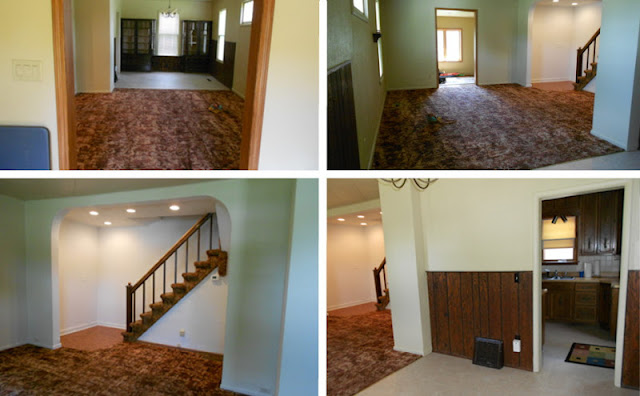 Oh, and one last thing. Did you notice the carpet? This is a classic shot of the flooring in this house. In the living room these three outdated flooring piece come together to form one nasty trifecta. As of yesterday the last of the brown flooring on the first floor is history.