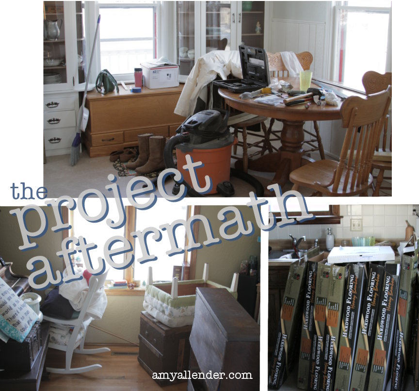 The aftermath is all the things that are amiss you your home and life after a project is complete. As you well remember, just over a week ago I impulsively ripped out our nasty, smelly brown carpet. Eight days later we had a new floor and were able to call this project complete.