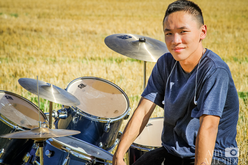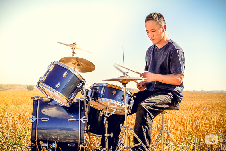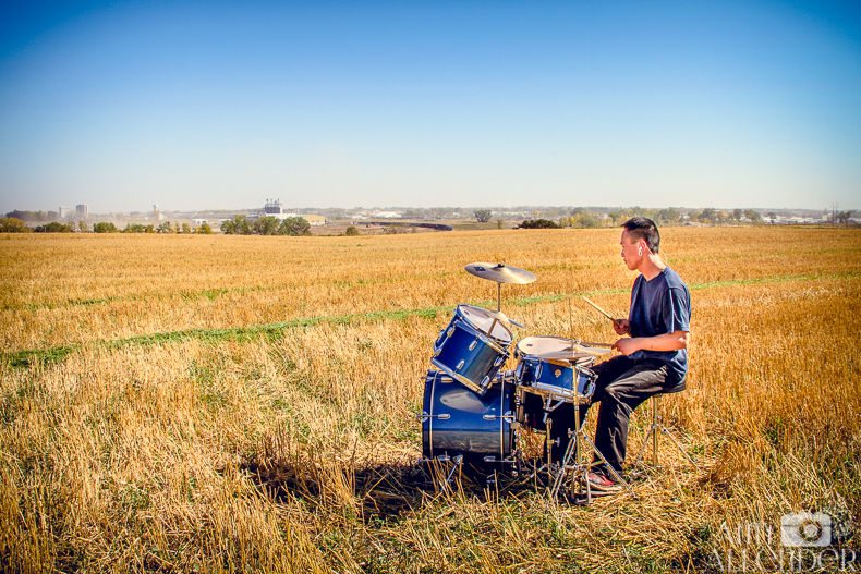 Then, when we were done with hub caps, we headed out of town. You see, earlier in the week I shot his sister Jenna’s senior portraits–you might remember her. At her session she and another sister told me they thought I should have Nathanael bring his drums out into a field. Once I realized that was a possibility he’d be up for, I was all over it. Great idea, ladies!